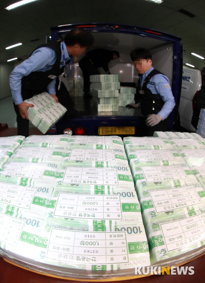 20일 오전 서울 강남구 한국은행 강남본부에서 설 명절을 닷새 앞두고 관계자들이 시중은행에 공급할 설 자금을 차량에 옮겨 싣고 있다.