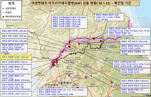 정원화 국립환경과학원 생물안전연구팀장은 “이번 폐사체들은 모두 2차 울타리 안에서 발견된 것으로, 추가 감염개체가 있는지 확인하기 위해 군과 협력해 폐사체 수색을 강화할 예정이다”라고 말했다.