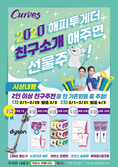 이 이벤트는 2, 3월 두 달간 진행되며, 가족, 친구 등 지인을 2명 이상 신규 회원으로 추천한 기존 회원 대상으로 추첨을 통해 경품을 증정한다. 1등에 무선 청소기를 비롯, 근력 강화를 돕는 커브스 프로틴, 체중 조절에 도움을 주는 커브스 슬림원 핏 등 건강 관리용 뉴트리션과 마사지용 ‘퓨어레스팅크림’등을 증정한다. 당첨 인원은 2, 3월 각 201명씩 총 402명이다.