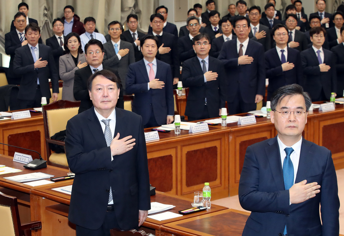 [쿠키뉴스] 박태현 기자 =윤석열 검찰총장이 10일 서울 서초구 대검찰청에서 열린 전국 지검장 및 선거 담당 부장검사 회의에서 국기에 경례하고 있다.