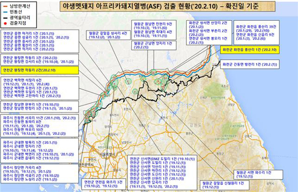 국립환경과학원은 10일 폐사체에서 아프리카돼지열병 바이러스를 확진하고 결과를 관계기관에 통보했다. 이로써 화천군에서는 55건, 연천군에서는 52건의 야생멧돼지 아프리카돼지열병이 확진됐으며 전국적으로는 177건으로 증가했다.