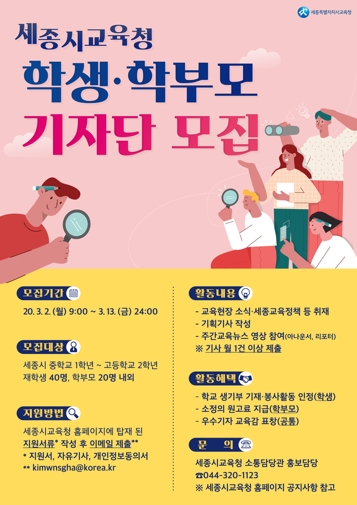지원 자격은 세종시 중학교 1학년에서 고등학교 2학년까지의 재학생 및 세종시에 소재한 학교의 학부모로 평소 글쓰기나 기사 작성, 사진 촬영과 영상 제작 등 언론, 미디어 분야에 관심이 있다면 누구나 신청이 가능하다.