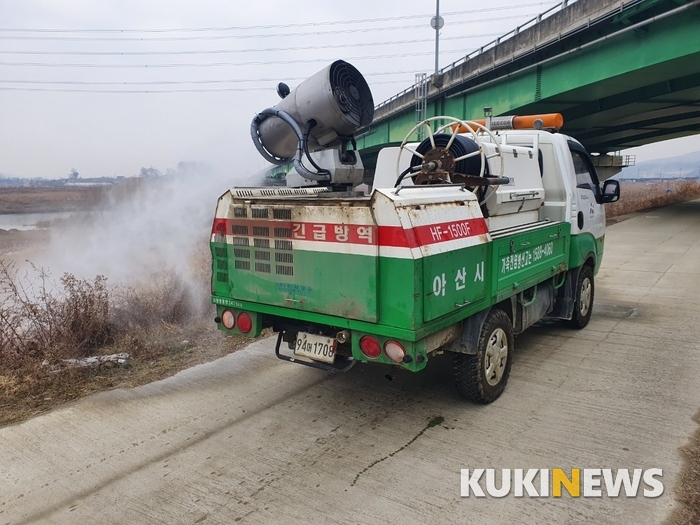 또한 곡교천(고위험)과 아산호(중위험) 철새도래지 주변소독을 위해 시에서 보유하고 있는 광역살포기 등 소독차량 2대와 아산축협 공동방제단 소독차량 3대를 동원해 방역을 펼치고 있다.