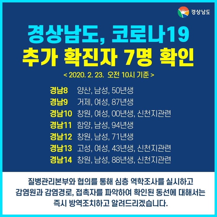 앞서 김경수 경남지사는 이날 경남도청 프레스센터에서 코로나19 추가 확진자 발생 관련 기자회견을 열고 “지난 22일 오후 5시 대비 코로나19 확진자 8명이 추가로 확인됐다”고 밝혔다.