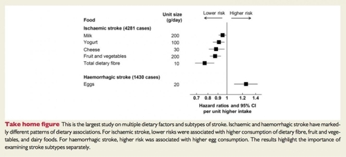특히 과일, 채소, 섬유질, 우유, 치즈, 요구르트 등은 허혈성 뇌졸중을 낮추는 데 도움이 되지만, 출혈성 뇌졸중 위험을 줄이는 것과는 상관이 없는 것으로 밝혀졌다.