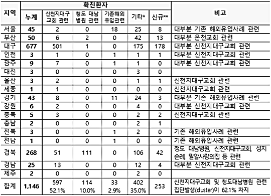 대구와 함께 많은 환자가 발생하고 있는 경북지역에서는 칠곡구 소재 ‘밀알사랑의집’, ‘예천 극락마을’, ‘다람노인요양 공동생활가정’ 등 각종 복지생활시설을 중심으로 환자가 나오고 있다.