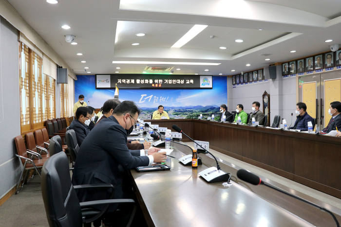 [옥천=쿠키뉴스] 명정삼 기자 = 충북 옥천군은 26일 군청 상황실에서 관내 기업인을 대상으로 지역경제활성화 교육을 실시했다.