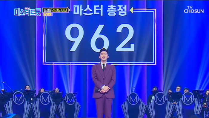 이 중 강력한 우승 후보로 꼽히는 임영웅은 설운도의 ‘보랏빛 엽서’ 무대로 962점을 받으며 1라운드 1위 자리에 올랐다.