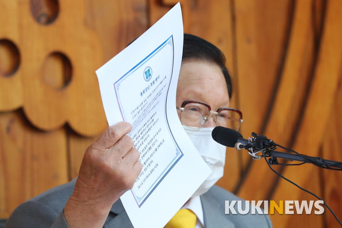 [가평=쿠키뉴스] 박태현 기자 =이만희 신천지예수교 증거장막성전 총회장이 2일 오후 경기 가평 신천지 평화의 궁전에서 열린 코로나바이러스 감염증(코로나19) 사태 관련 기자회견을 하고 있다.