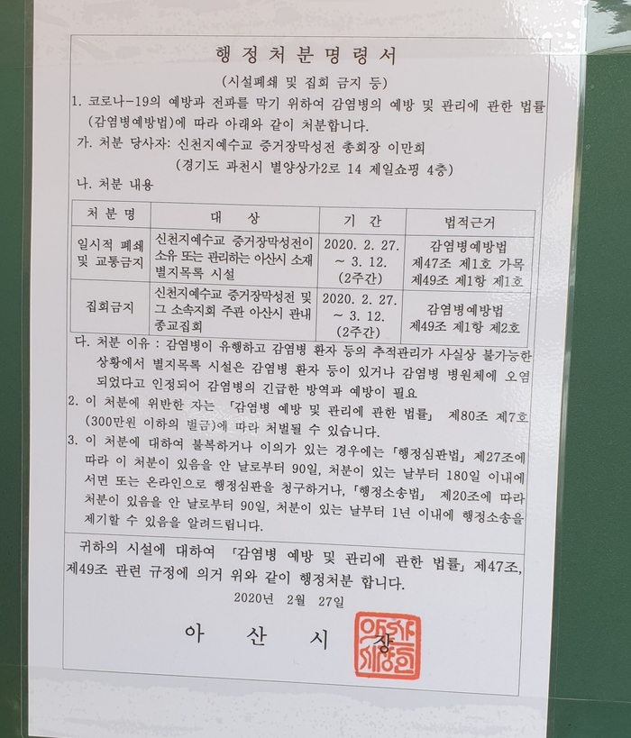 ※사진설명 : 관내 신천지 시설에 붙은 2월 27일자 아산시 행정처분명령서(시설폐쇄 및 집회 금지 등)