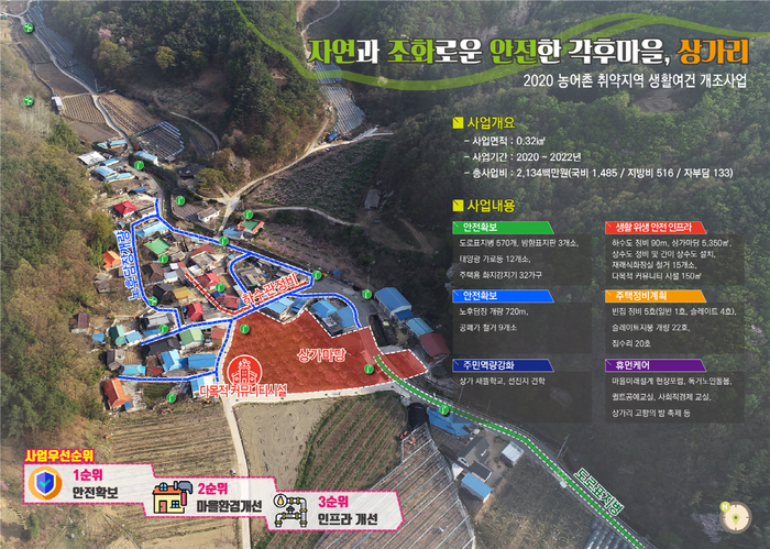영동읍 상가리 사업대상면적은 32.4ha로, 21억3천4백만원이 투입돼 태양광가로등 설치, 하수도정비, 다목적커뮤니티시설 신축, 노후담장 개량 등을 추진한다.