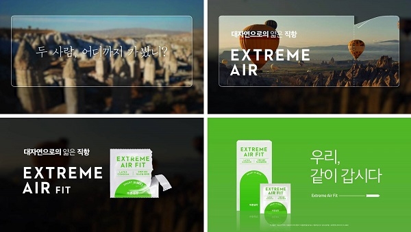 이번에 공개된 광고 영상은 ‘대자연으로의 얇은 직항’이라는 주제로, ‘두 사람 어디까지 가-봤니?’라는 중의적인 카피를 채용했다. 전 세계 유명 자연 지형지물들을 여행하며 느낄 수 있는 감각을 ‘익스트림 에어핏’의 장점인 얇은 착용감과 밀착감, 보습성에 빗대어 표현했다. 영상은 인트로를 포함해 ▲터키 카파도키아 편 ▲미국 메머드 케이브 편 ▲우유니 소금사막 편 ▲하와이 노스쇼어 파도 편으로 제작되었다.