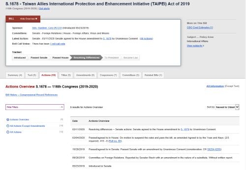 대만 자유시보 등은 13일 미 상원이 지난 11일 오후(미국 현지시간) 타이베이 법안을 만장일치로 가결해 도널드 트럼프 미 대통령의 서명 절차만 남겨 놓고 있다고 보도했다. 앞서 미 하원도 지난 4일(미국 현지시간) 의원 415명의 전원 만장일치로 타이베이 법안을 통과시킨 바 있다.