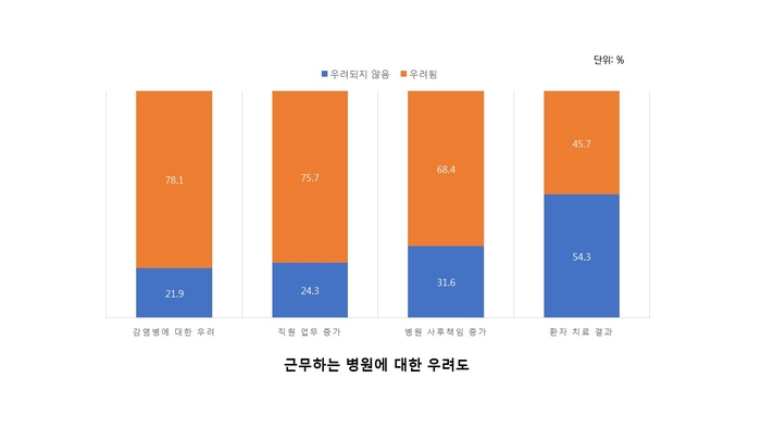 명지병원 직원들은 자신의 일터인 병원에 대한 높은 우려도 드러냈다. 병원 내 감염확산에 대해서는 응답자의 78%, 업무 증가는 76%, 병원의 사후책임은 68%가 우려를 표했다. 그러나 환자 치료 결과에 대한 우려는 46% 수준으로 낮았다.