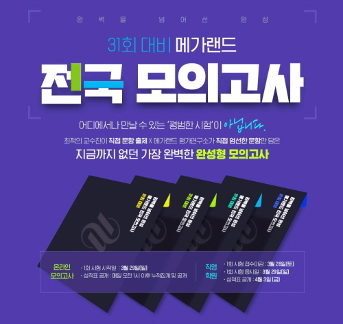메가랜드 관계자는 “이번 모의고사는 실제와 같이 다시 한 번 풀어볼 수 있도록 문제지와 해설지, OMR 카드를 제공할뿐 아니라 모의고사 성적표를 제공해 수험생들 각자가 자신의 성적 추이를 살펴볼 수 있도록 했다”며 “궁금증 역시 출제 교수가 직접 1:1로 해결에 나선다”고 전했다.