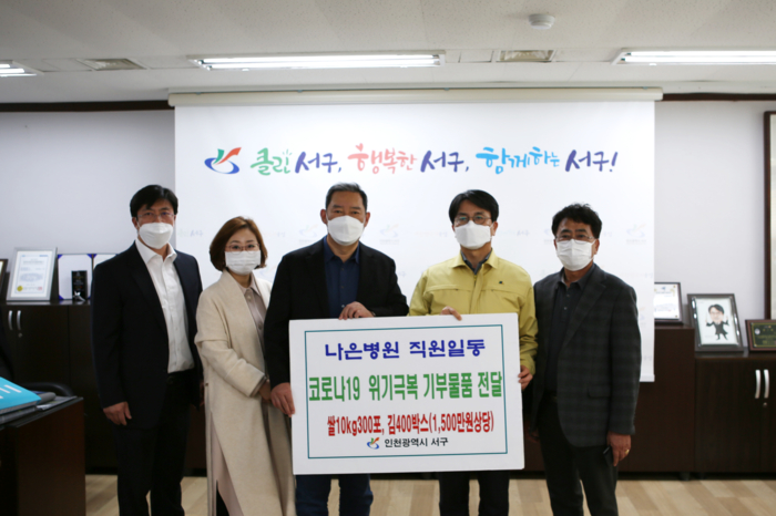 이번 성금은 인천나은병원 직원들이 코로나19 확산으로 인해 어려움을 겪고 있는 인천 서구 취약계층에 도움을 드린다는 취지로 마련되었으며, 인천나은병원의 코로나19 성금 모금을 위해 병원 내부적으로 각 부서마다 코로나19 희망 메세지를 적어 함께 사진을 찍어 홍보하는 방식으로 코로나19 희망모금운동을 벌였다.