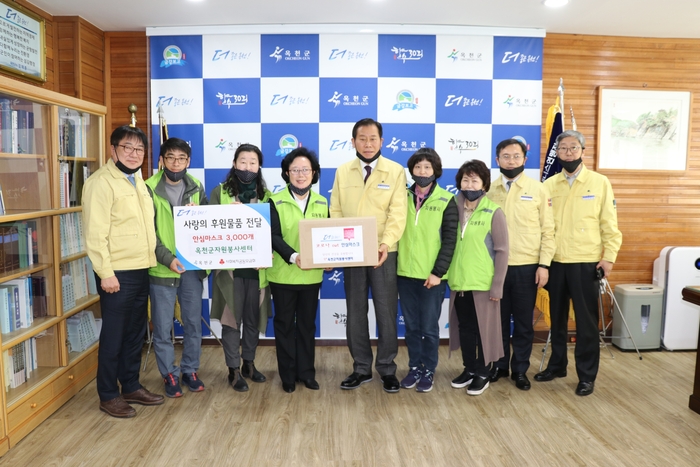 충북 옥천군자원봉사센터(센터장 금정숙)는 18일 옥천군청을 찾아 직접 만든 면 마스크 3,000개를 기탁했다.