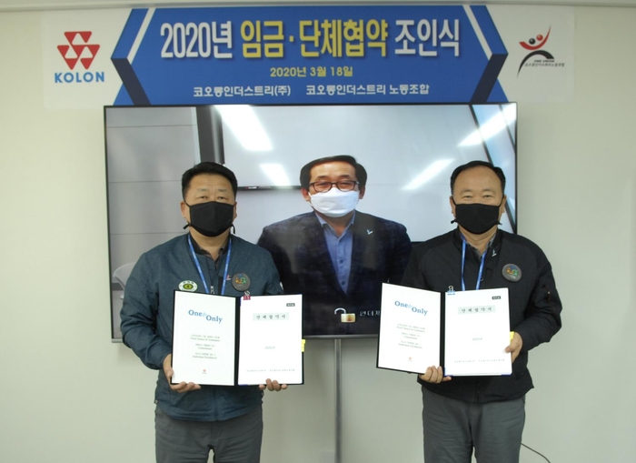코오롱인더스트리는 18일 코로나19를 감안해 화상회의를 통해 장희구 대표이사, 김연상 노동조합위원장 등이 참석한 가운데 ‘2020년 임금 및 단체협약 조인식’을 가졌다고 19일 밝혔다.