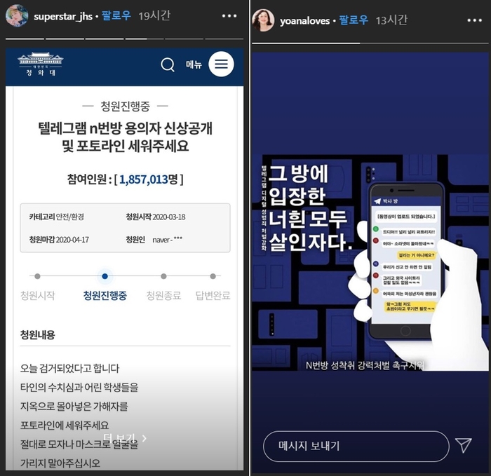 지난 18일 청와대 홈페이지 국민청원 게시판에 ‘텔레그램 n번방 용의자 신상공개 및 포토라인 세워주세요’라는 청원이 올라오자, 유명 연예인들이 이 청원을 개인 SNS 등에 공유하며 참여를 독려하고 있다.