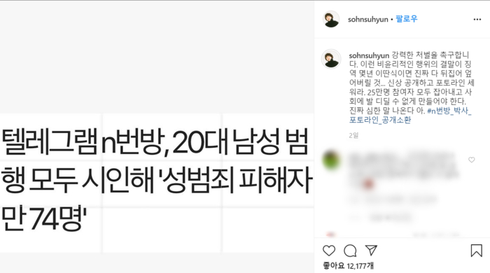 특히 손수현은 텔레그램 n번방으로 인한 피해자가 74만명이라는 기사 제목을 캡처해 SNS에 올리면서 “강력한 처벌을 촉구한다. 이런 비윤리적인 행위의 결말이 징역 몇년 이딴식이면 진짜 다 뒤집어 엎어버릴 것... 신상 공개하고 포토라인 세워라. 25만명 참여자 모두 잡아내고 사회에 발 디딜 수 없게 만들어야 한다”고 목소리를 높였다.