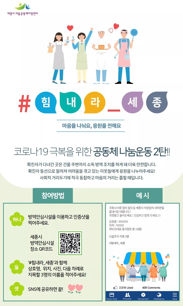 [세종=쿠키뉴스] 명정삼 기자 = 세종특별자치시(시장 이춘희)는 코로나19 확산으로 고통 받고 있는 소상공인을 지원하기 위해 방역안심시설(클린존) 방문 인증 릴레이 챌린지 ‘힘내라 세종’ 캠페인을 전개한다고 7일 밝혔다.
