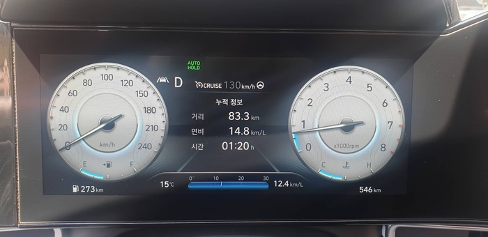 스마트스트림 가솔린 1.6 인스퍼레이션(최상위) 모델을 타고 83.3㎞를 주행하니 연비는 14.8㎞/ℓ를 기록했다.