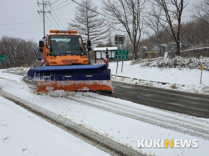 [태백=쿠키뉴스] 김태식 기자 =12일 대설주의보가 내린 강원 태백시 함백산에 새벽부터 많은 눈이 내린 가운데 제설차량이 제설작업에 분주하다.