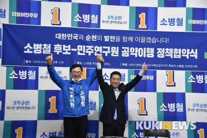 [순천=쿠키뉴스] 전송겸 기자 =더불어민주당 소병철 후보(전남 순천시·광양시·곡성군·구례군(갑))와 민주당 정책연구소인 민주연구원(원장 양정철)이 정책협약식을 가졌다.