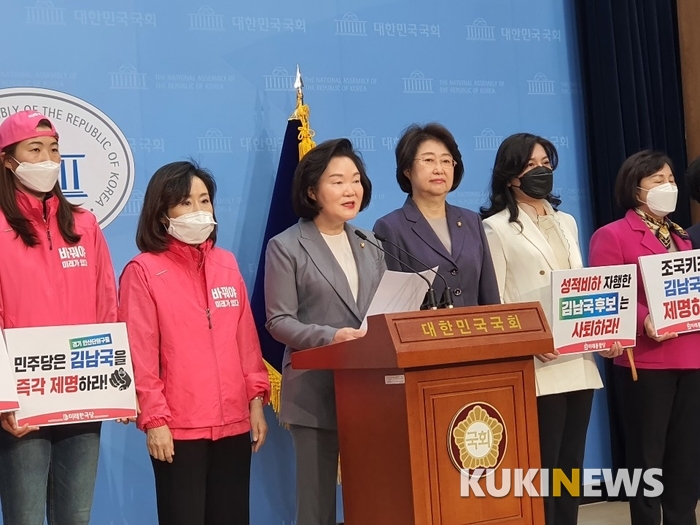 [쿠키뉴스] 조진수 기자 =미래통합당·미래한국당 여성 국회의원, 여성 후보자, 여성 당직자 일동이 더불어민주당 김남국 후보 사퇴를 촉구했다. 더불어 민주당에는 사죄하라고 요구했다.