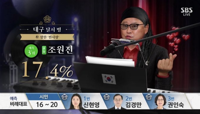 무릇 한국의 선거 방송은 예상치 못한 패러디와 뛰어난 컴퓨터 그래픽(CG) 기술로 완성된다. 정치적 엄숙주의를 깨드린 방송사들의 기발한 합성 이미지 덕택에 온라인에선 ‘합법적 명예훼손’이라는 신조어도 생겨났다. 이번 선거의 ‘합법적 명예훼손’은 SBS와 MBC의 이파전이었다. MBC는 후보자들이 BTS·모모랜드·싸이 등 K팝에 맞춰 춤을 추게 했고, 각 지역구 투표율을 해당 지역의 특산물에 빗대 표현하기도 했다. 하지만 가장 아찔했던 순간은 SBS가 후보자들을 유명 가수에 패러디했던 때였다. 가령 SBS는 대표적인 친박계 인사인 조원진 대구 달서병 후보를 가수 스티비 원더와 합성해 배경음악으로 ‘이즌 쉬 러블리’(Isn’t she lovely)를 내보냈다. 화룡점정은 “그녀(박근혜 전 대통령으로 추정)를 향한 사랑은 이뤄질까요?”라는 아나운서의 내레이션. 이 외에 청와대 출신인 고민정 광진을 후보는 ‘달빛 아래 노래를 부르는 셀린 디온’이 됐고, 윤건영 서울 구로을 후보는 ‘문워크 춤을 추는 마이클 잭슨’이 됐다. 문재인 대통령의 성씨 ‘문’(Moon)에 착안한 패러디다.