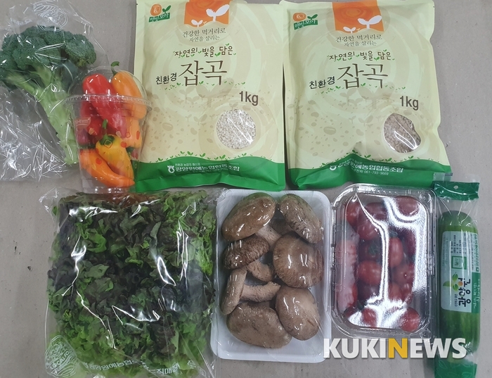 친환경 농산물 꾸러미는 방울토마토와 찹쌀, 애호박, 상추, 현미, 표고버섯, 파프리카, 브로콜리 8개 품목이 담겼으며, 원아의 어린이집·유치원에서 꾸러미 한 상자씩을 보호자가 수령하면 된다.