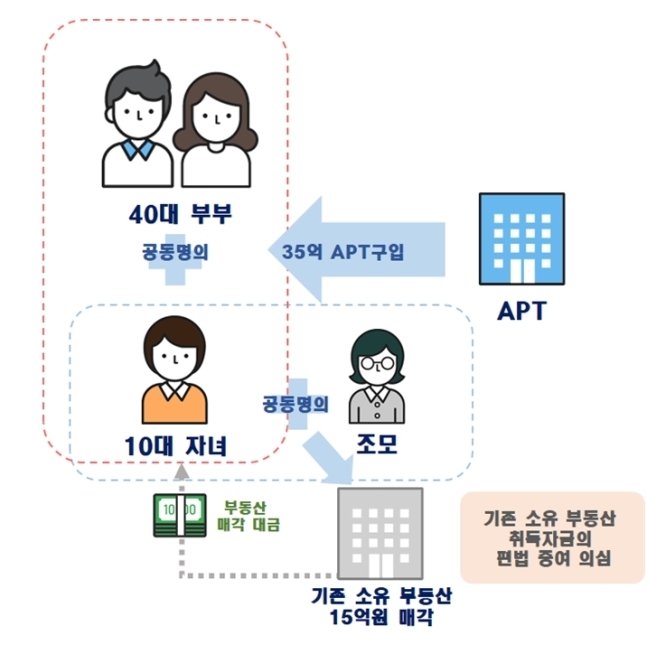 쿠키뉴스] 안세진 기자 =#10대 청소년인 A씨는 부모님과 공동명의로 서울 강남구 소재 약 35억원짜리 아파트를 구입하며 기존에 조모와 공동명의로 소유하던 약 15억원대 주택을 매각했다. 이같은 사실은 친족 등이 소득없는 미성년자에게 기존 소유한 부동산을 편법증여한 사례로 의심돼 국세청에 통보됐다.