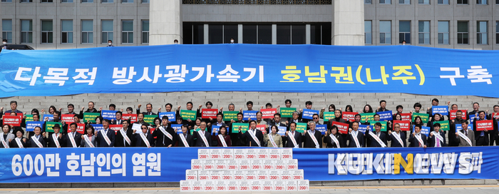 [무안=쿠키뉴스] 전송겸 기자 =‘방사광가속기 호남권 유치 위원회’는 27일 국회 본관 앞에서 관계단체 회원 75명이 참석해 범국민 서명 230만명 돌파 대국민 보고대회를 갖고, 정부와 국회에 ‘방사광가속기’ 호남권 구축을 촉구한 호소문을 전달했다