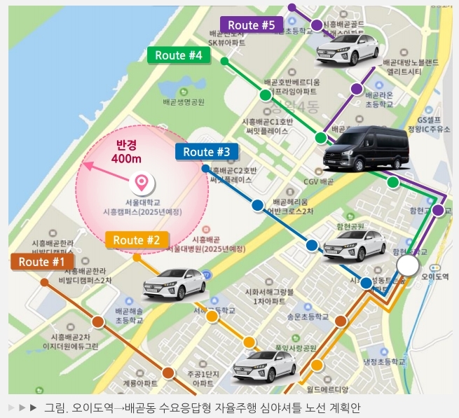 서울대 컨소시엄은 오이도역~시흥 배곧신도시 구간에서 심야 안전귀가 셔틀 서비스를 무상 제공할 계획이며, 내년 말까지 시흥시에 총 8대의 자율주행 셔틀 도입을 목표로 하고 있다.