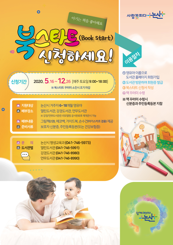 북스타트 관련 자세한 사항은 논산시도서관 홈페이지를 참고하거나 평생교육과 도서정책팀(☎041-746-5973)으로 문의하면 된다.