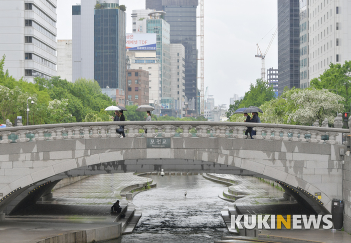 [쿠키뉴스] 박효상 기자 = 전국에 비가 내리고 쌀쌀한 기온을 보인 15일 오후 서울 청계천에서 시민들이 우산을 쓰고 걷고 있다.