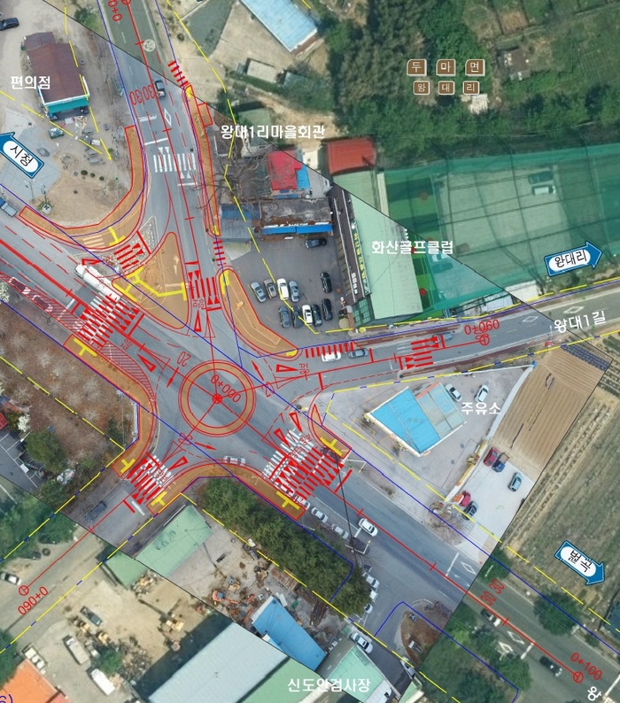올해는 2억8천만원(국비1억4천만원, 시비1억4천만원)의 예산을 확보해 왕대오거리에 중앙교통섬 17m, 내접원 지름 27m, 교차로 내 속도 27km/h로 설계된 회전교차로를 설치한다.