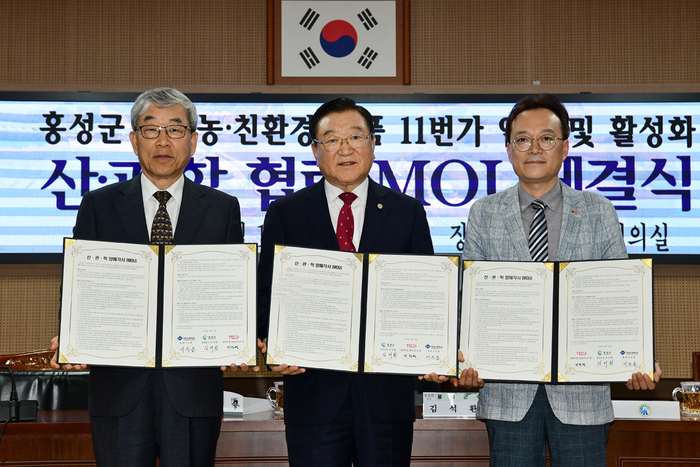 [홍성=쿠키뉴스] 명정삼 기자 = 충남 홍성군이 지역 내에서 생산되는 친환경‧유기농식품의 판로확대와 온라인 유통 활성화를 위해 대한민국 대표 온라인 쇼핑몰인 11번가(주), 청운대학교와 손을 맞잡았다(사진).