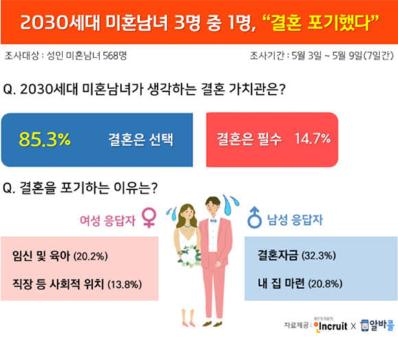 취업포털 인크루트와 바로면접 알바앱 알바콜이 5월21일 부부의 날을 맞아 성인 미혼남녀 568명을 대상으로 결혼가치관 설문조사를 실시한 결과 이같이 나타났다고 밝혔다.