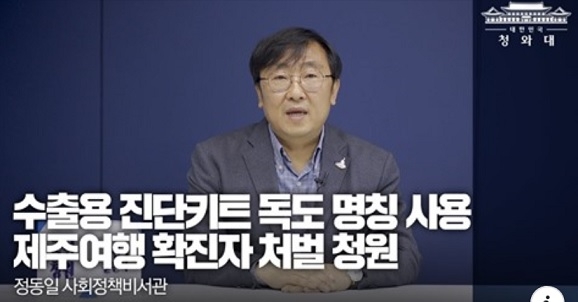 정동일 청와대 사회정책비서관은 25일 국민청원 답변에서 진단키트 이름은 정부가 개입할 수 없는 민간 영역이라며 이같이 말했다.