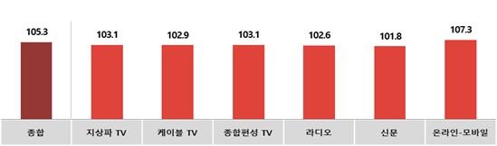 [그림1] 전월대비 6월 매체별 광고경기전망지수(KAI)