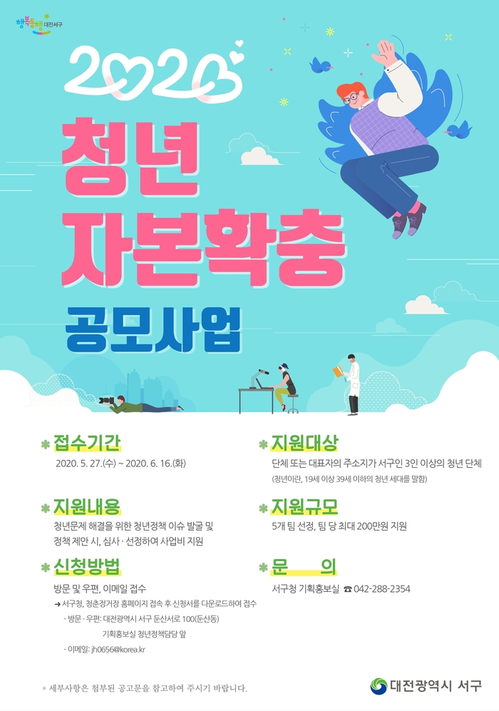 [대전=쿠키뉴스] 명정삼 기자 = 대전 서구(구청장 장종태)는 청년들의 능동적인 사회참여 기회를 제공하기 위하여 2020년 ‘청년자본확충 공모사업’을 실시한다고 31일 밝혔다.