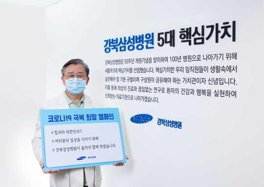 ◎신호철 강북삼성병원장, ‘코로나19 극복 희망 캠페인 릴레이’ 동참= 신호철 강북삼성병원장이 최근 코로나19 극복을 위한 희망 캠페인 릴레이에 참여했다. 희망 캠페인 릴레이는 코로나19로 어려움을 겪고 있는 의료진과 국민들에게 전하는 응원 문구를 적어 SNS 등에 게재하고 다음 참여자를 지목하는 방식으로 진행된다.