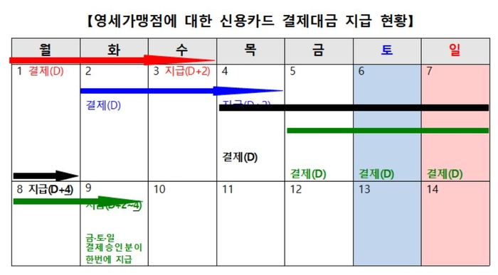 카드사는 그동안 연매출 5억원 이하 영세 신용카드 가맹점에 카드 결제 후 2영업일 이내 카드매출대금을 지급해 왔다. 그런데 주말이나 공휴일 등에는 대금이 지급되지 않아, 금요일 결제 승인분의 경우 4영업일이 지난 그 다음주 월요일에나 지급이 됐다.