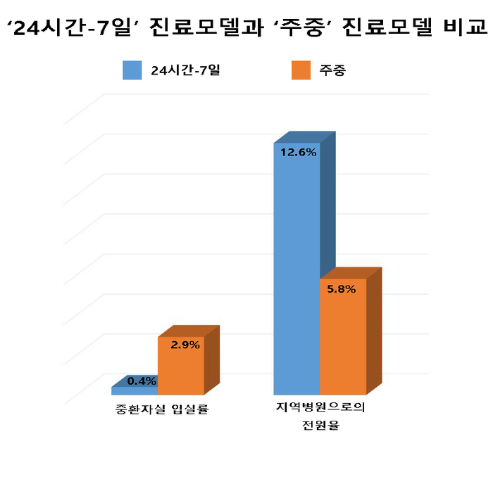 연구결과, 입원전담전문의가 상주하는 ‘24시간-7일’ 모델이 ‘주중’ 모델보다 환자 임상결과가 우수했다. 24시간-7일 모델의 중환자실 입실률은 0.4%(1명)로 주중모델의 2.9%(8명)보다 7배가량 낮았다. 반면, 지역병원으로의 전원율은 24시간-7일 모델이 12.6%(30명)으로 주중 모델의 5.8%(16명)보다 2배 이상 높았다. 특히, 여러 변수를 보정한 결과 병동 내 사망위험이 주중모델에서 2배 가량 높았다. 즉, 병동에 입원한 환자의 임상지표는 입원전담전문의가 상주했을 때 더 우수했다.