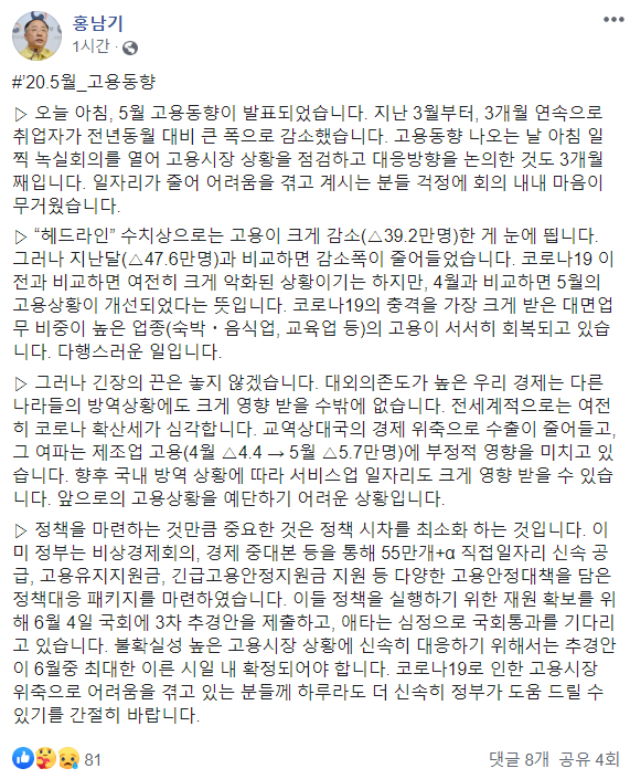 [쿠키뉴스] 송금종 기자 = 홍남기 부총리 겸 기획재정부 장관은 10일 페이스북에 “고용상황을 예단하기 어렵다”며 추가경정예산안(추경)의 빠른 통과를 호소했다.