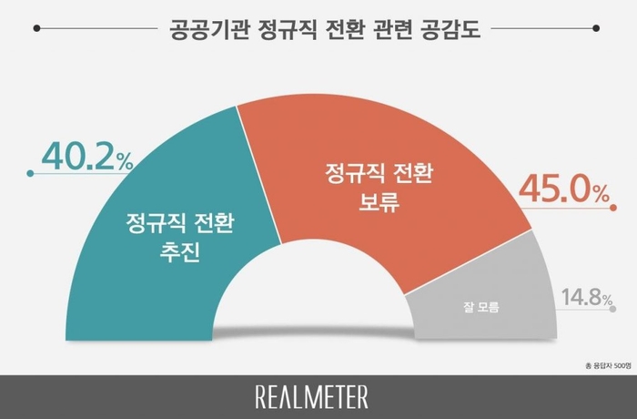 여론조사 전문기관 리얼미터가 YTN 의뢰로 만 18세 이상 성인남녀 500명을 대상으로 지난 22∼26일 공공기관 정규직 전환 관련 의견에 대한 공감도를 조사) 95% 신뢰수준에서 ±4.4%p)한 결과, 전체 응답자 중 45.0%가 ‘역차별 우려 등 부작용을 고려해 정규직 전환을 보류해야 한다’는 의견에 공감했다.