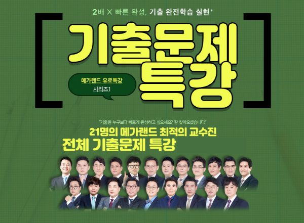 이번 특강에는 메가랜드 교수진 21명이 참여한다. 역대 기출문제를 종합해 31회 시험에 대비할 수 있는 강좌와 교재를 제작했다. 민법 등 공인중개사 시험에 출제될 만한 예상 기출문제 위주다.