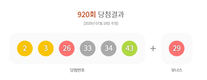 [쿠키뉴스] 김태구 기자 =18일 진행된 제920회 로또복권 추첨 결과 1등 당첨번호는 로 결정됐다. 2등 보너스 번호는 ‘29’다.
