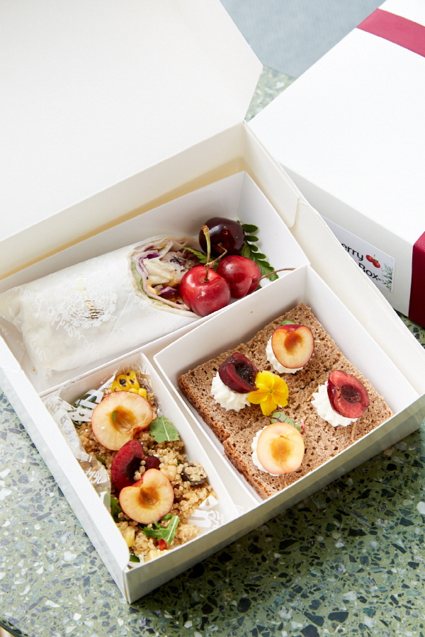 *재료 : 토르티야(1장), 양상추(큰잎1장), 로메인(2장), 닭가슴살(½개, 소금, 후추 약간), 샌드위치용햄(1장), 파프리카(빨강, 노랑), 청오이(¼개씩), 적채(20g), 쉬레드체다치즈(2작은술), 체리(7알), 체리스프레드(크림치즈 100g, 체리 10개)
